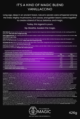 Cappuccino (33% magere melkpoeder, glucosestroop, 19% oploskoffie, kokosolie, suiker, melkeiwit, stabilisator: E340/E452, natuurlijke aroma’s, emulgator: E471, antiklontermiddel: E551), Vanille (Inuline, stukjes karamel [suiker, cacaoboter, rijstzetmeel, rijsmiddel: natriumbicarbonaat], natuurlijke aroma’s, smaakstoffen, zoetstoffen [sucralose, steviolglycosiden uit stevia], lactose, antiklontermiddel [siliciumdioxide], kleurstof [caroteen]), Ceremonial Cacao (Theobroma cacao), Lion’s Mane (Hericium erinaceus) 50:1, Chaga (Inonotus obliquus) 30:1, Cordyceps (Cordyceps sinensis) 30:1, Maitake (Grifola frondosa) 30:1, Shiitake (Lentinula edodes) 20:1, Reishi (Ganoderma lucidum) 30:1. Waarschuwing: Kan sporen bevatten van schaaldieren, eieren, vis, soja, melk, noten en lupine.